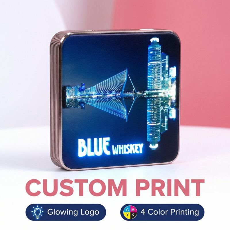 This is an exclusive private-mold wireless charging power bank, designed with a compact square shape for ultimate portability. It comes with a capacity range of 5000mAh to 10000mAh, supports 15W fast wireless charging (plus wired fast charging), and is equipped with a high-density lithium battery for stable, long-lasting power output. The standout features are its full-color 4C printing surface and custom glowing logo, paired with fully customizable OEM color options, making it the perfect premium promotional gift and personalized tech accessory.