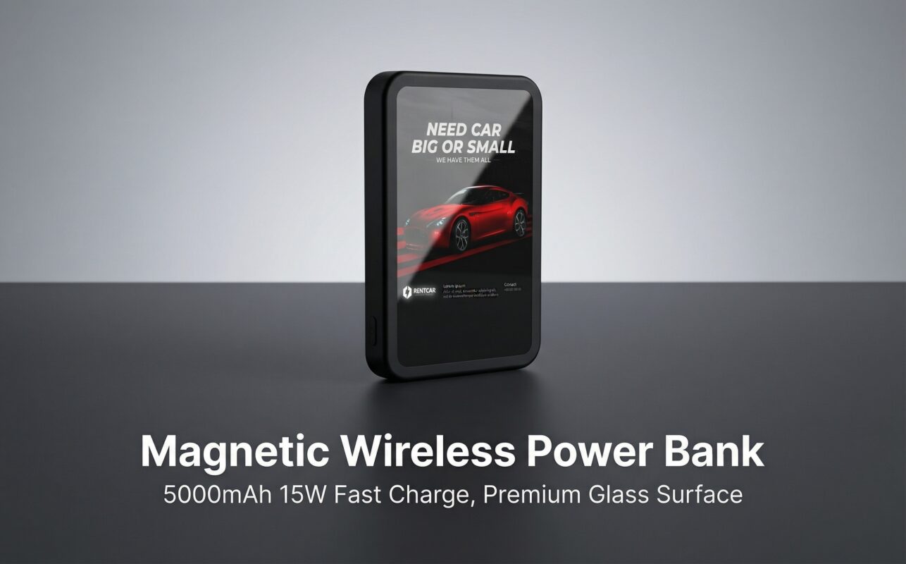 This is an exclusive private-mold magnetic wireless charging power bank with a 5000mAh capacity, perfectly balancing portability and daily power needs. Its standout design features a premium tempered glass cover with vibrant full-color custom printing, paired with a dynamic glowing logo for eye-catching brand exposure. It supports 15W high-speed wireless fast charging and offers small-batch OEM color customization, making it an ideal personalized gift and high-end promotional tech accessory for businesses, events, and personal gifting.