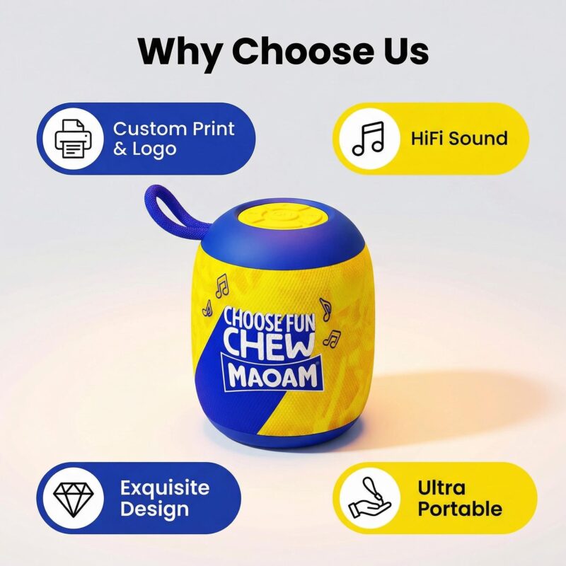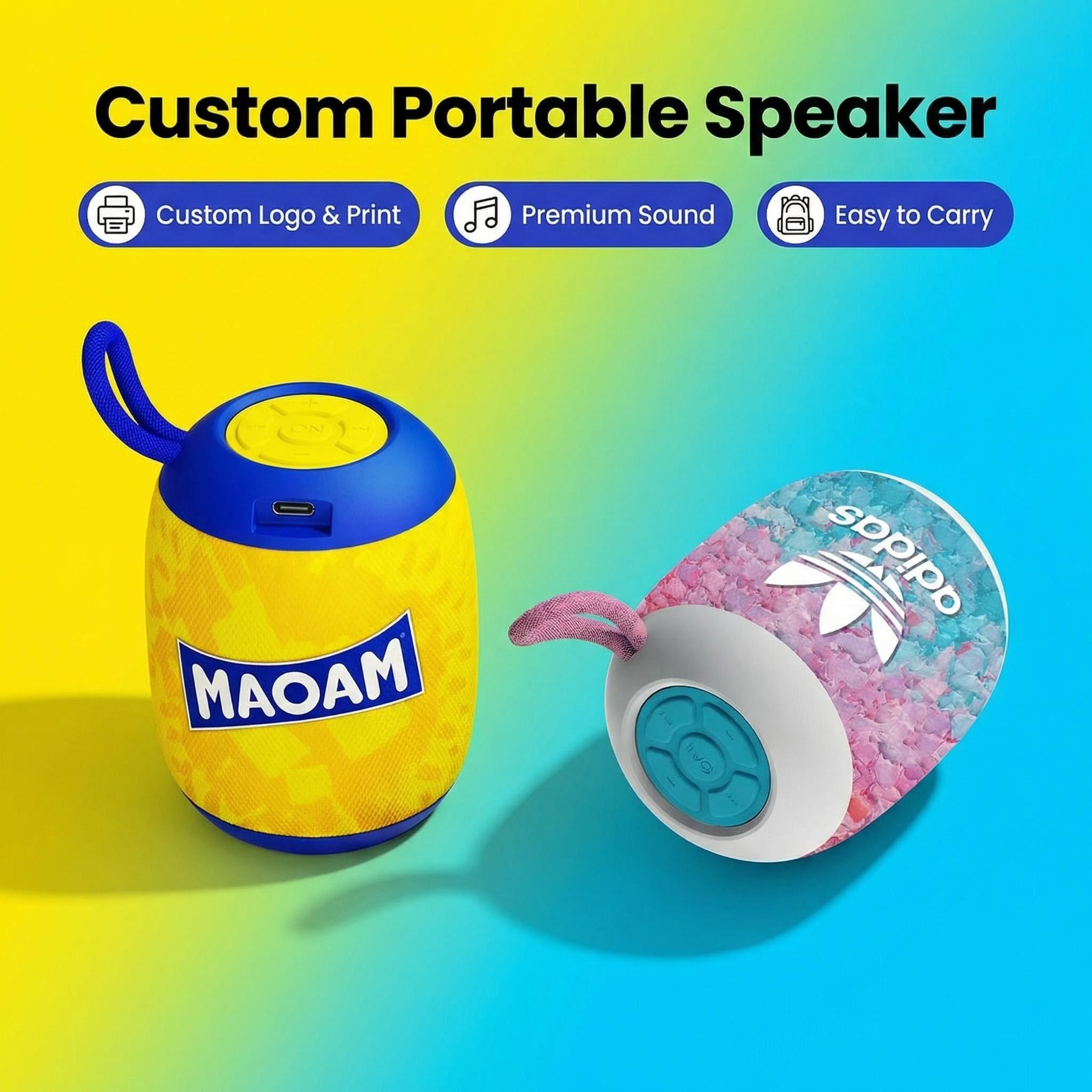 This is an exclusive private-mold Bluetooth speaker with an exquisite and unique design. It delivers outstanding Hi-Fi sound quality with rich bass and clear treble, bringing you an immersive audio experience. The highlight lies in its full customization capability: it supports 2D logo printing and full-color all-over printing to showcase your brand or personal style, and custom color options are available even for small-batch orders. Equipped with a convenient carrying strap, it is ultra-portable, making it ideal for travel, outdoor activities, daily use, and as a perfect gift or promotional item.